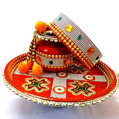 As Karva Chauth marks the deep affection and love of a wife towards her husband, it is one of the most auspicious festivals celebrated in North India. You can make this auspicious occasion even more special by gifting your wife a decorative Karva Chauth thali. This celebration of love is incomplete without the puja essentials, gifts, sweets, fruits, home decors, and thali set. This Karva Chauth, delight your wife and give her more reasons to feel content. Visit our online store and check out the amazing collection of decorative karva chauth thalis. Carefully handcrafted with elegant décor items like beads, pearls, threads, velvet, and much more, our decorative thalis are an absolute value for money. Also, the thalis come with a diya, kalash, channi set, decorative cloth piece, dhoop, rice, kumkum, camphor, dry fruits and sweets. Buy decorative karva chauth thali online and add sparkles of joy, cheer, and bliss to your big day.