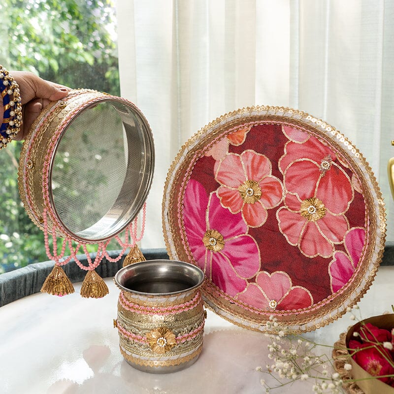 Previous NextThis Floral Radiance Pink Karwa Chauth Thali Set is perfect for couples looking for a sophisticated and elegant way to mark their commitment. The exquisite floral design and the couple vrat add to the divine and exclusive feel of the set, creating a beautiful marriage of art and tradition. Celebrate your vows with grace and style with this luxury thali set.