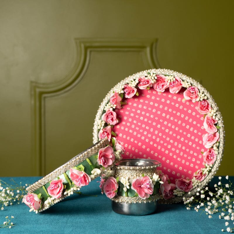 Previous NextThis Blooming Beauty Pink Rose Karwa Chauth Thali Set is perfect for your special day! Its beautiful design of pink roses and golden accents provides a timeless and elegant look for your marriage. Perfect for making the festivities of Karwa Chauth special.