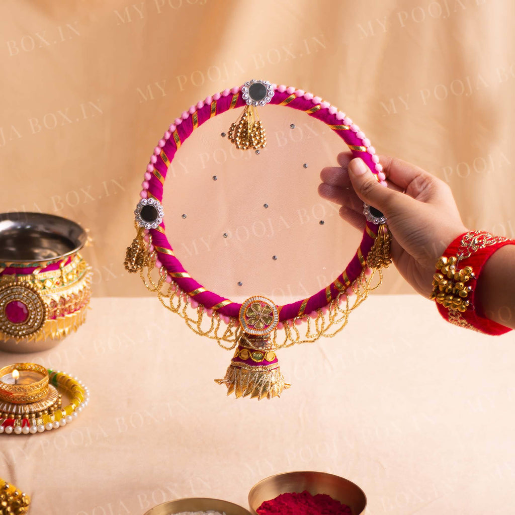 Karwa chauth is the most awaited festival where the wives keep a fast and pray for the long life of their husbands. This age-old tradition is widely celebrated with sheer excitement and love every year. What makes this celebration even more interesting? It is the moment when your wife looks at you through the beautiful karwa chauth channi. Do you want to capture this beautiful moment and cherish it for a lifetime? Check out our fantastic collection of Karwa chauth accessories and buy channi set online. When it comes to choosing from a variety of designer channi sets, you will be spoilt for choice. Decorated with textured cloth pieces and attractive gemstones, each channi set is handcrafted with elegant design patterns. Also, have a look at our unique collection of Karwa Chauth thali sets and personalized karva chauth gift hampers. This year, ditch the ordinary, and order from our beautiful collection of channi sets.