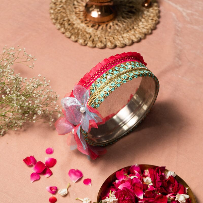 Previous NextThe Mermaid Mint & Pink Sieve for Karwa Chauth is perfect for that special time of year when the moon glows and your love shines brighter. Crafted from luxurious material, it's your perfect companion for this traditional ceremony. Enjoy its beauty and elegance for an unforgettable experience.