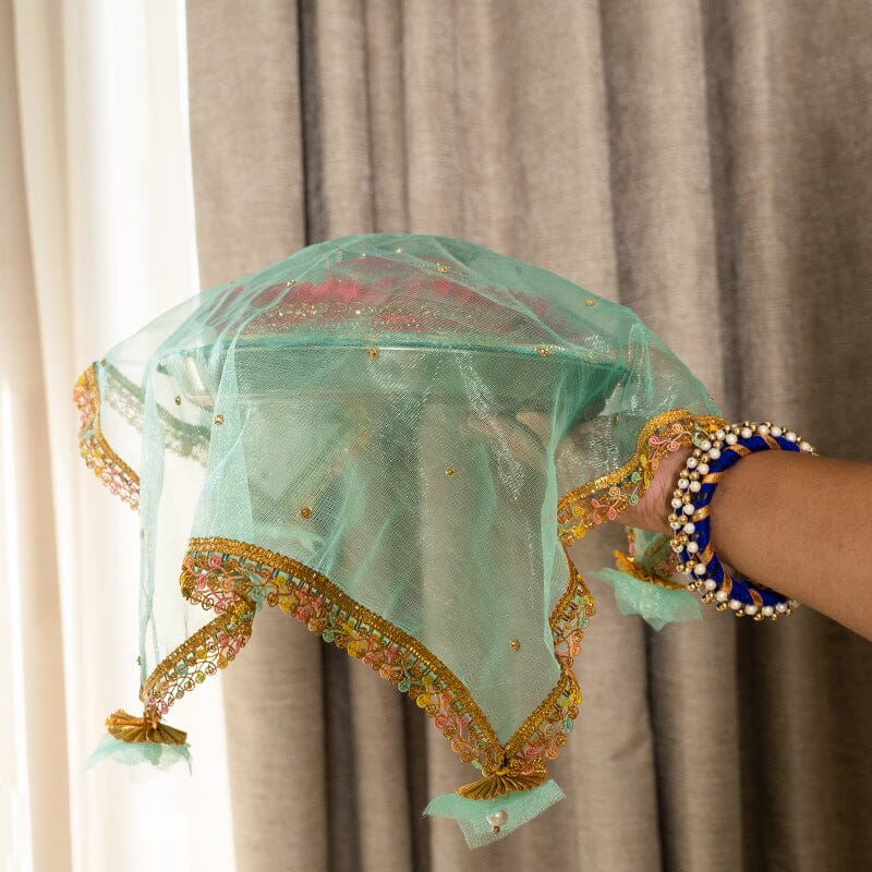 Previous NextThis delightful Prismatic Mint Green Thali Cover is perfect for traditional pooja rituals. Its prismatic design adds a special touch to any special occasion, while the durable fabric ensures that it will last for many years to come.