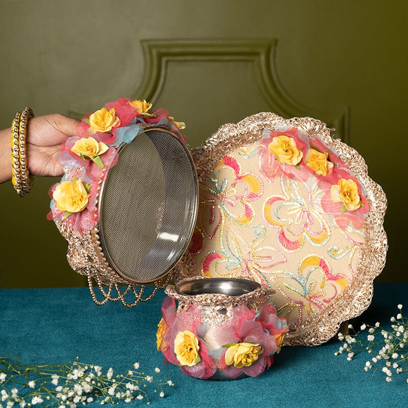 Make this Karwa Chauth more special with our Floral Blossom Karwa Chauth Thali Set. The set includes beautiful and intricately crafted floral designs with a contemporary touch. Perfect for traditional celebrations, our set is perfect for a memorable Karwa Chauth.